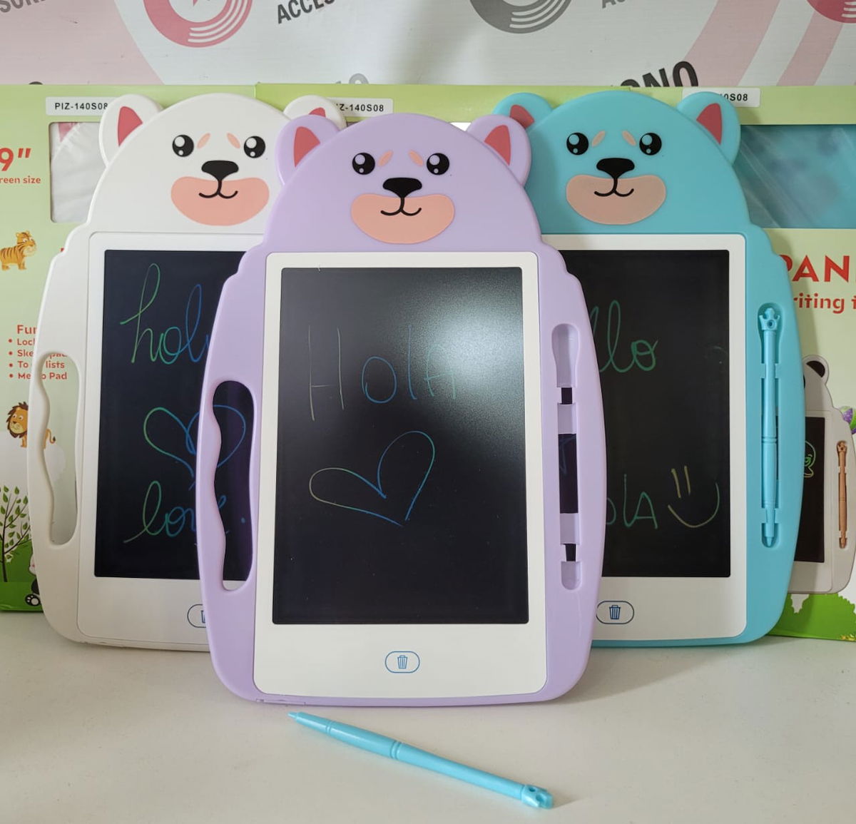 Pantalla de escritura de 9 pulgadas con diseño de osito sensible a la presión, duradera y ultraligera. Diseño ligero y portátil. Variedad de colores.
