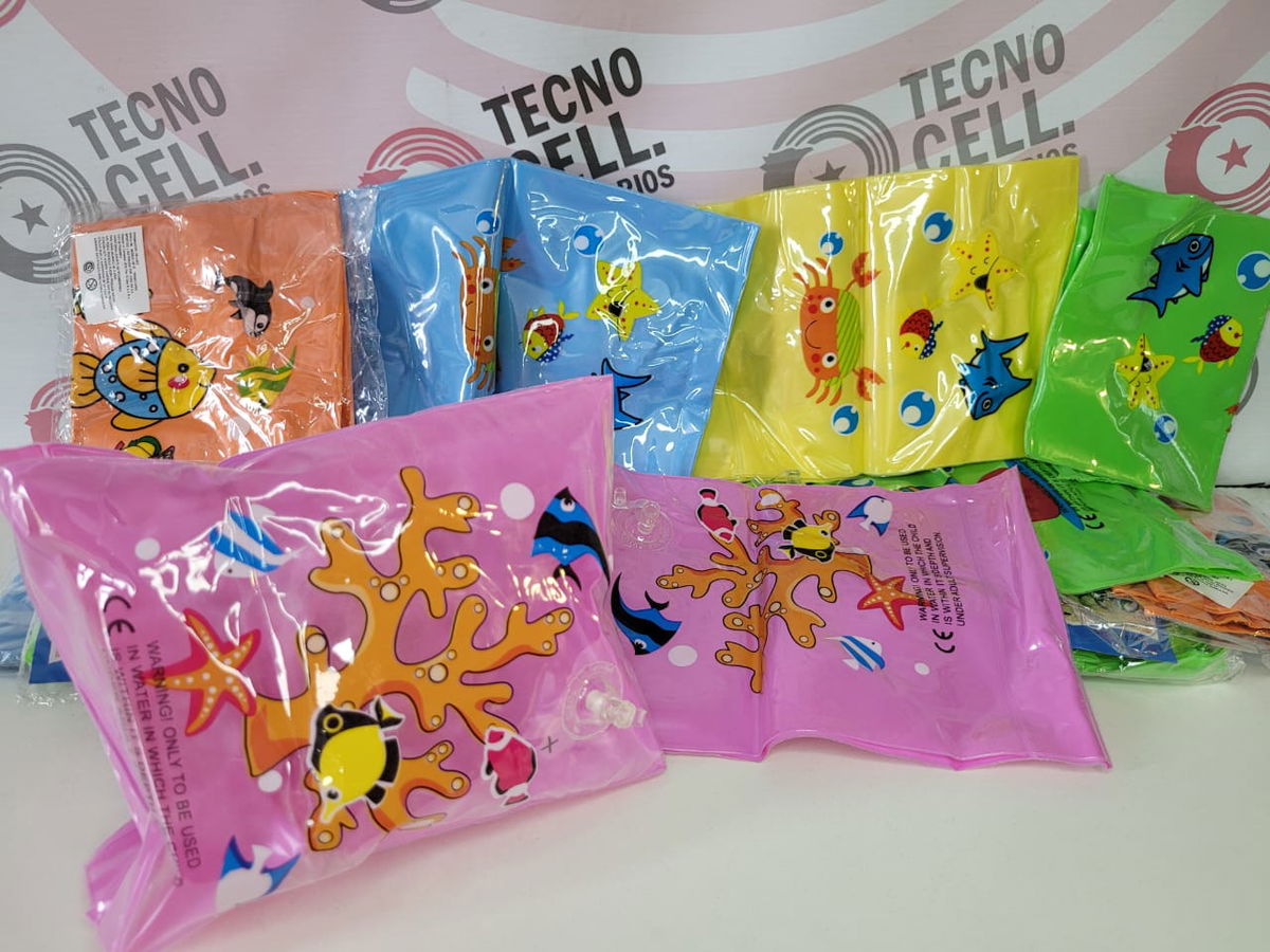 Viene en pares y está equipada con dos cámaras de aire, lo que proporciona una mayor flotabilidad y seguridad. Las medidas son 20 cm x 13 cm, tamaño ideal para los brazos de los niños. Hecha de PVC, un material duradero y resistente
