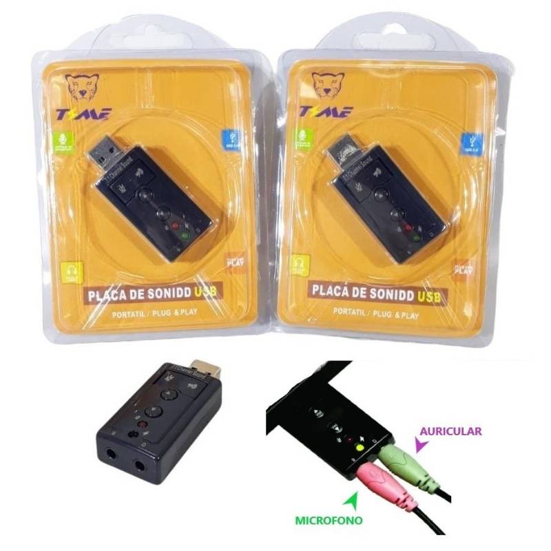 Placa de sonido externa con conectividad USB para una fácil instalación y uso.