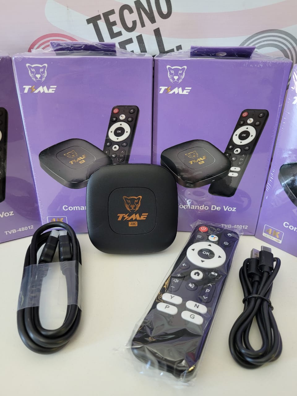 El producto en la imagen es un TV Box de la marca TIME, modelo TVB-48012. Este dispositivo está diseñado para convertir un televisor en un Smart TV, permitiendo el acceso a aplicaciones de streaming y otras funciones de internet.