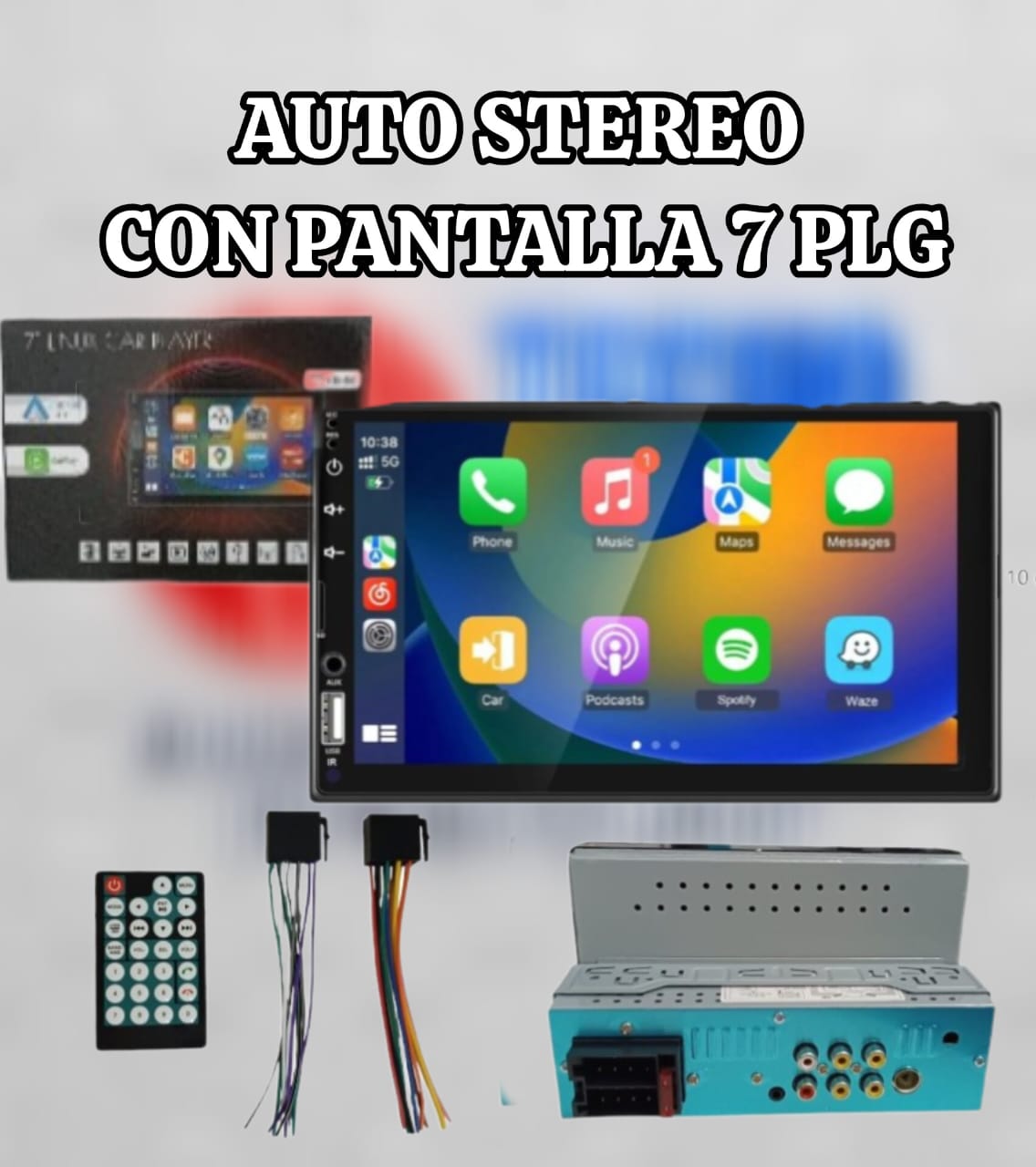 - Aplicaciones: La pantalla muestra íconos para aplicaciones como Teléfono, Música, Mapas, Mensajes, Podcasts, Spotify y Waze.