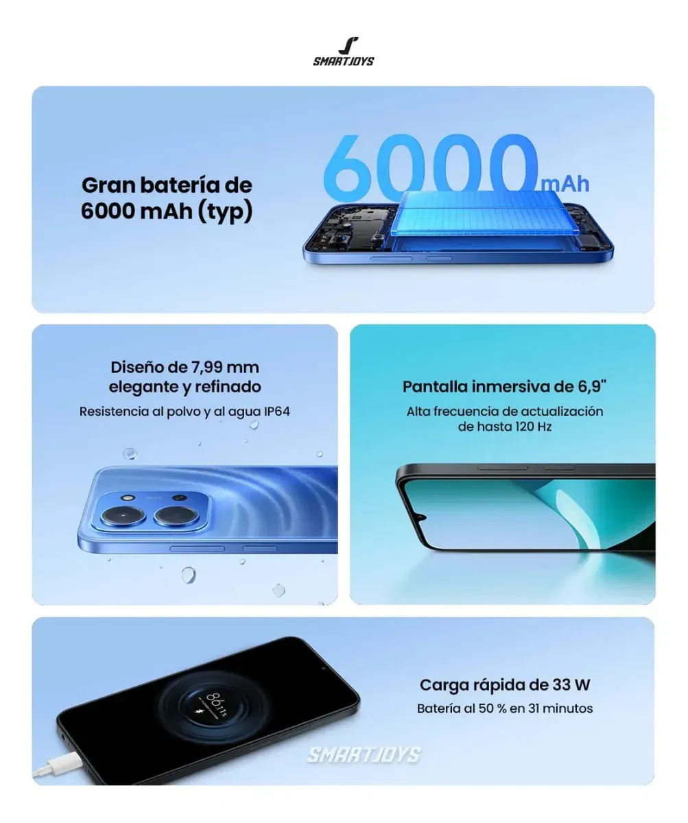 Equipado con un procesador Mediatek Helio G81 Ultra de 2 GHz, el Redmi 15c ofrece una experiencia fluida y rápida, ideal para quienes buscan eficiencia en su día a día. Su conectividad 4G garantiza que siempre estés conectado, ya sea para trabajar o disfrutar de tus redes sociales.